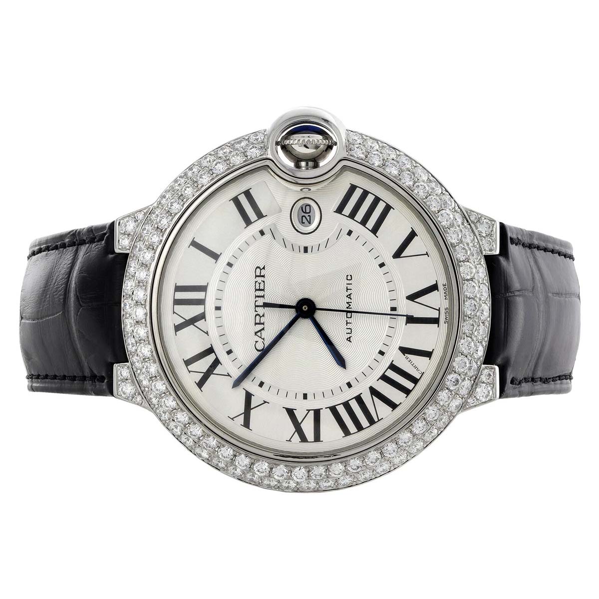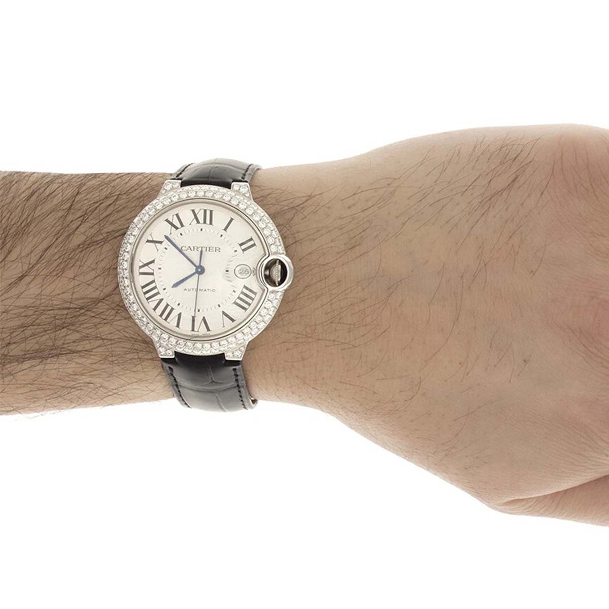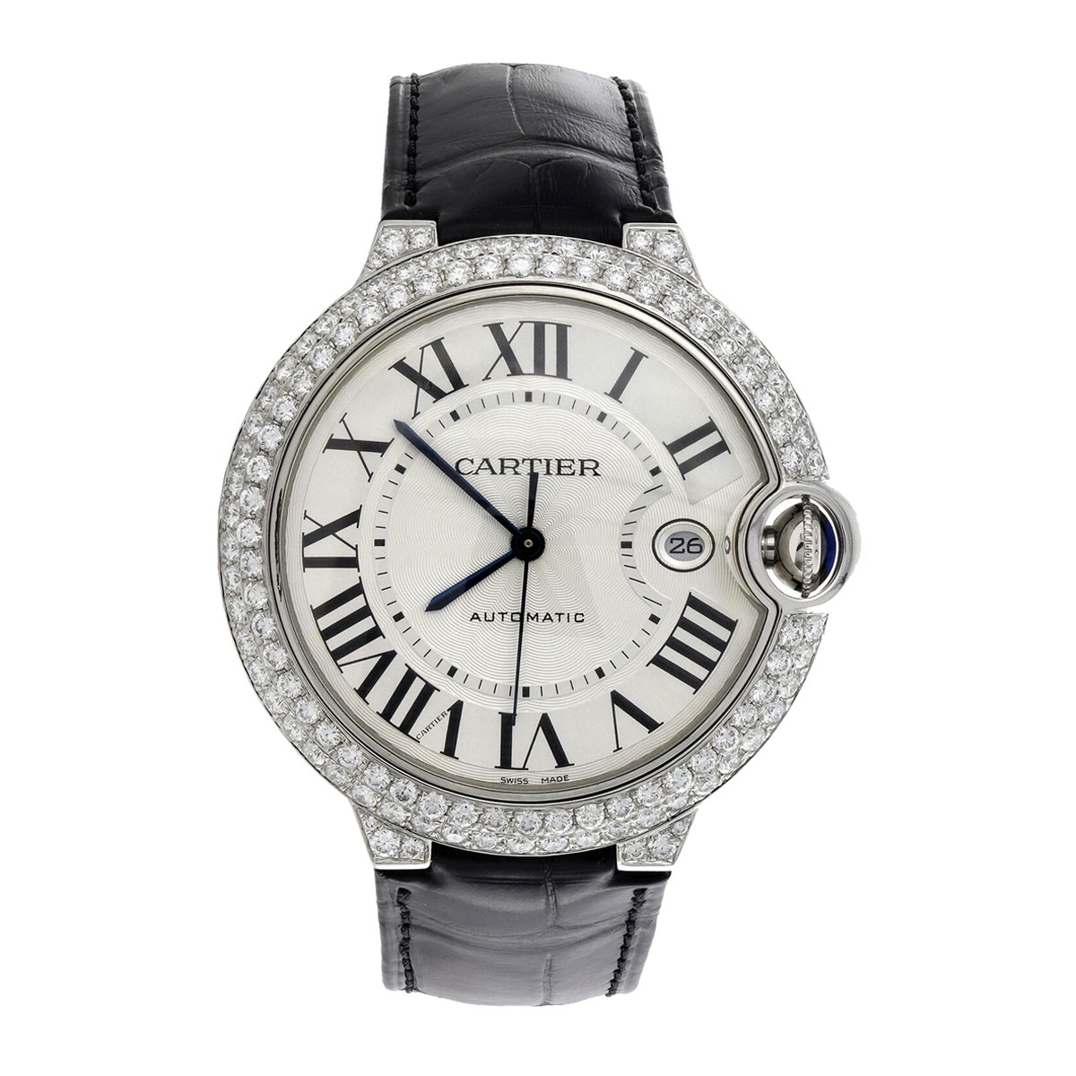 Tags: 18k white gold, alligator strap, automatic movement, Ballon Bleu, date window, diamond bezel, roman numerals, sapphire crown, silver dial